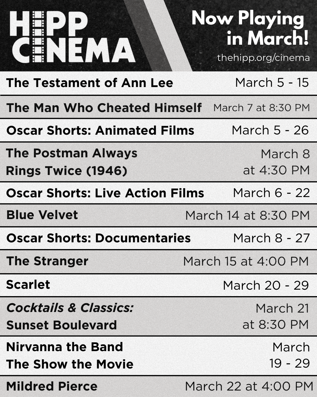 Member discount of $2 per ticket for every Hippodrome Cinema programmed movie (available exclusively through our box office or phone reservation)
